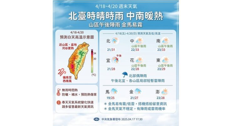 至於未來幾天的天氣變化,天氣風險公司指出,週五與週日分別有兩波微弱鋒面接近或掠過北台灣一帶,儘管鋒面結構偏弱,預期台灣本島無明顯降雨,但週末期間,西北部地區仍有可能因鋒面前後的對流雲系發展而出現局部短暫陣雨,不過整體雨勢還是偏弱,而中北部與東部山區易有短暫雷陣雨。