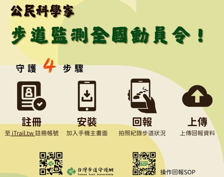 個人組:將回報頁面截圖,寫下一小段話,並標註#2025台灣步道日與#台灣步道守護網(或 #itrail),並上傳至社群平台。如:我在七星山!#2025台灣步道日#台灣步道守護網。
