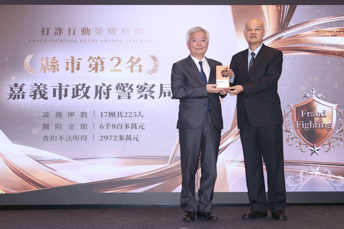依近5個月的受理數、破獲數、攔阻金額、查緝詐欺集團等指標,嘉義市政府警察局查獲詐騙集團17團225人,攔阻6,800餘萬元、查扣不法所得2,972萬元,榮獲縣市組第二名,由警政署署長張榮興親自頒發「打詐英雄獎」。
