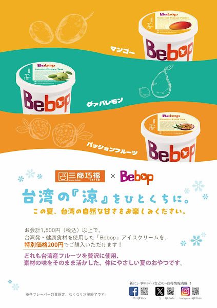 值得一提的是,Bebop 也是台灣首家以植物性原料製作的冰淇淋品牌。如今不僅讓國人享受健康美味的選擇,首批 Bebop 水果雪酪,即日起於 日本三商巧福赤坂店 限量登場。凡單筆消費滿 1500日圓,即可 200元日圓優惠價 加購雪酪,售完為止。未來,三商餐飲將持續攜手更多團隊,把台灣味推向世界舞台,一同品嚐台灣的創新風味。
