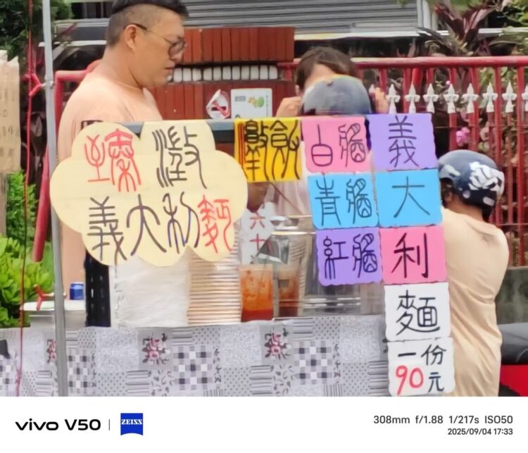 屏東長治,星期二、四下午都有黃昏攤販擺攤,這家義大利麵,裡面用字全數用小篆,還懂得沒有的字,同音借用。燉飯、白醬、青醬,紅醬還好認,臻宸,宸用「澂」替代。現在經過記者解說,下次在長治長興國小正對面看到這家古文字小販,不妨如是想,先來個思古幽情,假設「秦代時期李斯,趙高,胡母敬他們如果透過時空隧道來此地,應該會開心是買一些的。」因為他們看得懂文字。
