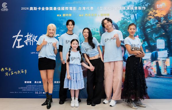 (《左撇子女孩》今舉辦試片,演員張允曦(左起)、夏騰宏、葉子綺、馬士媛、黃鐙輝和導演鄒時擎一同亮相)
