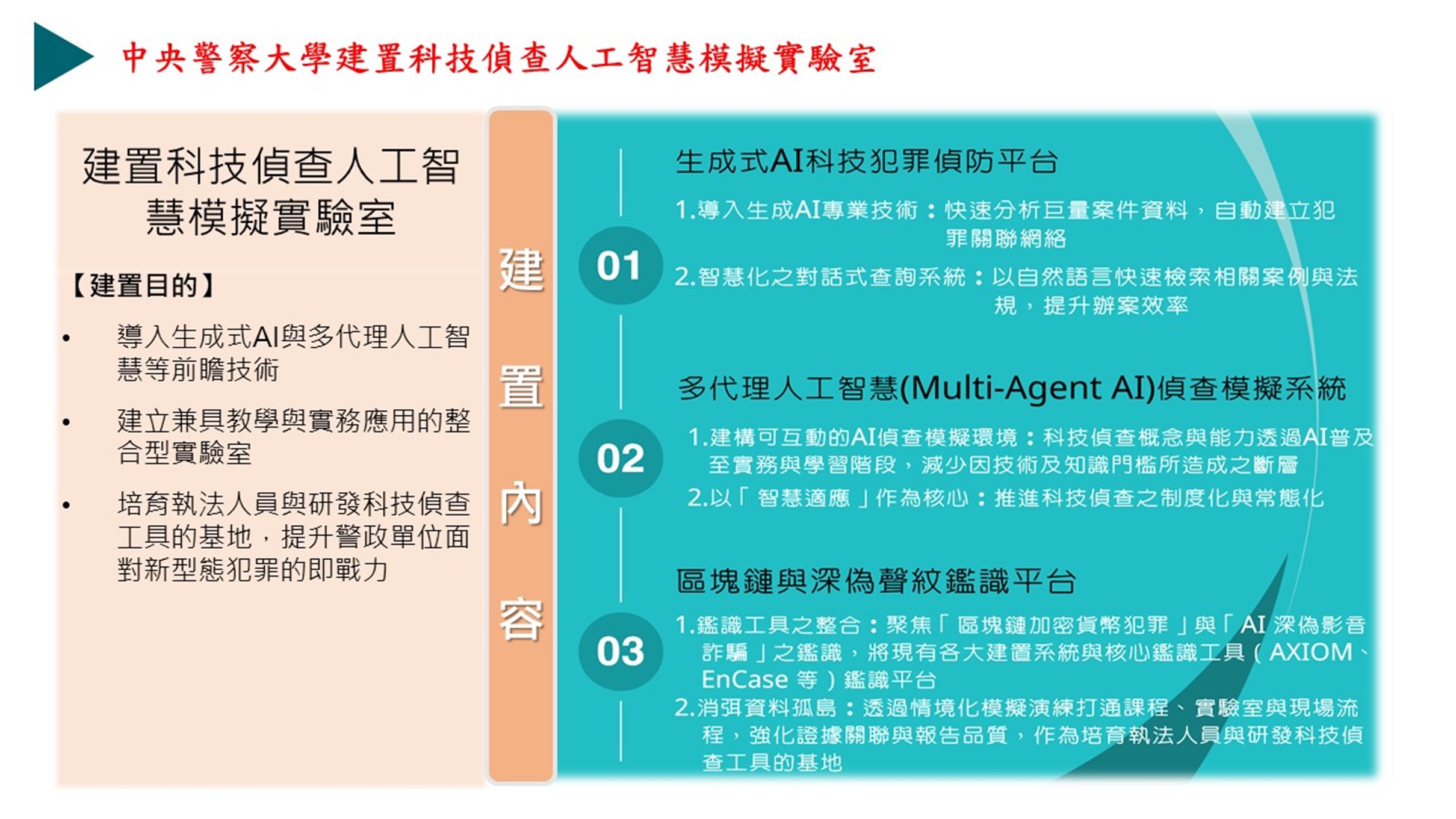內政部指出,警察大學113至115年推動教學強化計畫,在導入人工智慧(AI)、無人機等先進技術,並建置加密貨幣追蹤、數位證據分析及大數據偵查系統,有效提升執法效率與偵查精準度。為延續成果並因應新型態治安挑戰,將持續精進智慧科技執法與安全防護教學量能提升,更加強化科技素養與應變能力之培育,以培養新世代警察所需專業能力。