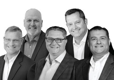 圖片由 Newmark 提供。後排,由左至右:Chris Shaida 和 David Stanford。前排:John Seaton、Dan Sterk 和 Phillip McCorkle。五位全部加入 Newmark,在 Newmark RF 品牌下擔任領導職位,向該公司提供數十年策略、運營、科技與客戶顧問的經驗。