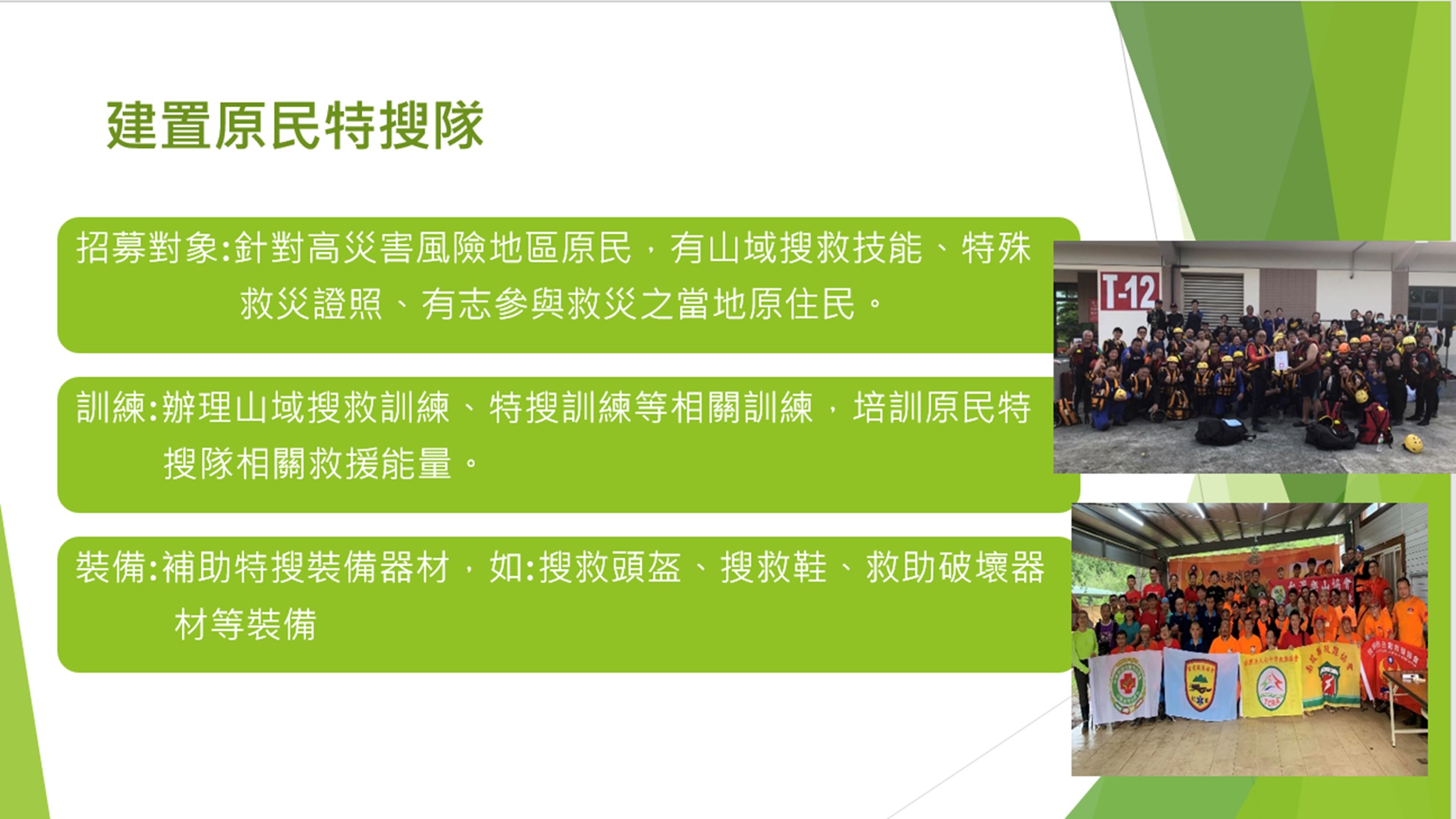 劉世芳指出原民部落多位於偏遠山區,交通不便、地質脆弱,災害發生時常成為孤島地區,亟需強化在地防救災能力。因此消防署與原民會及新北市、桃園市、新竹縣、苗栗縣、臺中市、南投縣、嘉義縣、高雄市、屏東縣、宜蘭縣、花蓮縣及臺東縣等12個縣市政府,研究應用中程計畫推動成立原民特搜隊規劃,辦理救援訓練補助裝備器材,如搜救頭盔、救助服、軍刀鋸、拋擲救援器材組及破壞器材等。未來,原民特搜隊將配合計畫,導入既有訓練及裝備補助,協助原民特搜隊取得專業初期救援能量。