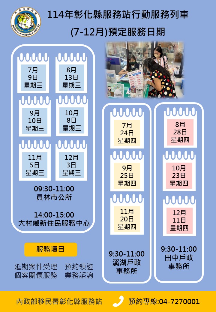 田中鎮,古稱「田中央」,因四週皆為水田而得名,至彰化市約1小時車程。為免民眾舟車勞頓之苦,彰化縣服務站與田中戶政事務所合作,每2個月定期設櫃就近服務當地民眾,並帶來最新的在臺生活新知。適逢新學期開學,移民署也積極走訪各大專校院,與外籍學生近距離接觸,透過面對面宣導說明居(停)留相關規定,協助學生瞭解在臺生活基本法治觀念,並且學習如何自我保護,陪伴學生安心學習。另外移民署更設有「1990馬上幫您」外來人口在臺生活諮詢服務熱線,提供中、英、日、越、泰、柬語服務,遇到問題不知如何求助時,歡迎隨時撥打,讓在臺生活更加便利。