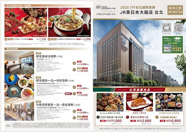 除了餐飲優惠,JR東日本大飯店台北也祭出多款住宿券優惠搶攻國旅市場,最低26折起。「都會客房純住房券」旅展價4,999元;「都會客房一泊一食住宿券」含兩客自助早餐旅展價5,999元,並推出買8送1限量優惠。升級住宿選擇「行政尊榮客房一泊一食」旅展價6,999元,除早餐外還可享行政酒廊專屬禮遇,是商務與休閒旅人最理想選擇,針對企業與團購客群,飯店更推出住宿券買10送1優惠,提供更彈性、實惠的出行方案。