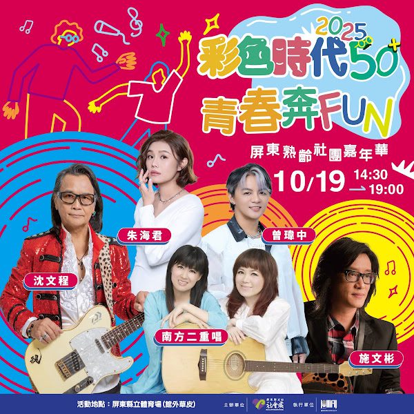 除了金曲卡司演出,活動同步安排30組熟齡社團接力演出,涵蓋歌唱、舞蹈與樂團等多元展演。現場規劃25攤社團互動體驗與30攤創意市集,集結在地美食、文創手作與友善商品,打造熱鬧又有感的熟齡交流場域。活動並設置多個政令宣導攤位,整合長照、健康與社福資源,透過互動遊戲傳遞實用知識,推動世代共融、寓教於樂。截至114年9月底,屏東縣65歲以上人口已達21.59%,正式邁入超高齡社會。屏東縣政府社會處以「彩色時代50+」為品牌核心,打造熟齡自我實現舞台,並透過音樂與創意參與,落實「活力、創新、共融」的樂齡城市願景。