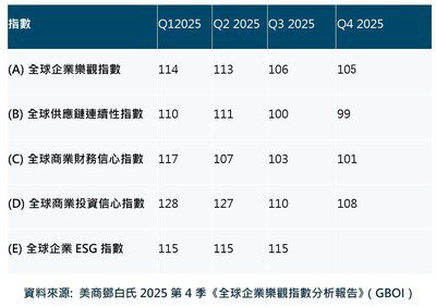2025年第四季全球企業樂觀指數跌幅趨緩,大型企業在供應鏈重組與市場多元化方面展現出更高的調整能力,信心指數季增 3.2%,成為支撐整體穩定的關鍵力量。