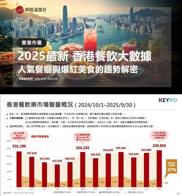 《香港網路溫度計》透過「 KEYPO 大數據關鍵引擎」分析近一年的網路貼文與留言,發布最新產業報告《2025香港餐飲大數據》,揭示過去一年港餐飲的相關貼文留言總量突破 240萬筆,平均每月約 20萬筆的網路討論內容。報告指出,隨着市場消費復甦與社交活動回暖,港人對「餐廳優惠、新店開幕、節慶聚餐」等話題的關注持續攀升,香港的餐飲網路熱度正穩步上揚。