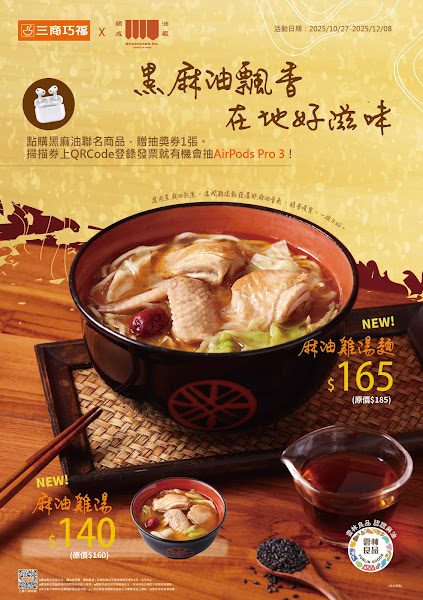 活動期間,購買黑麻油聯名新品可獲抽獎券乙張。掃描券上活動QRCode登錄發票即可抽AirPods Pro 3,並享有品牌專屬優惠:.三商巧福門市單筆消費滿250元折30元.順成油廠官網輸入折扣碼,單筆消費滿500元折50元。