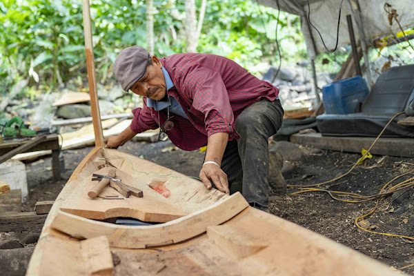 (《大海浮夢》呈現夏曼・藍波安親自伐木造舟 以身實踐海洋文學的過程 (目宿媒體提供))