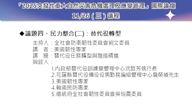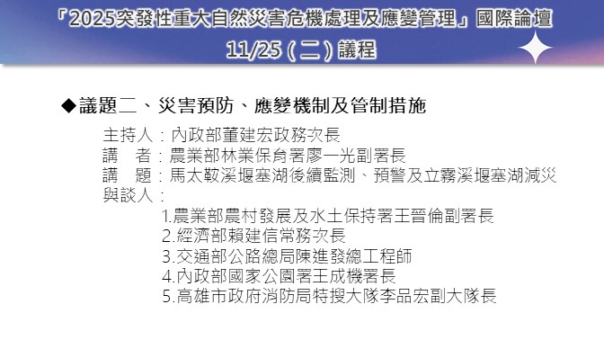 內政部指出,近年極端氣候事件日益頻繁,如何在突發性重大自然災害發生時,兼顧中央與地方的指揮協調、提升災害預警與應變效率,已成為國家韌性治理的重要關鍵。本次論壇將以馬太鞍溪堰塞湖及立霧溪堰塞湖災害為例,規劃五大議題,分別為「極端氣候下災害風險評估與分析」、「災害預防、應變機制及管制措施」、「民力整合(一):志工與防災協作中心」、「民力整合(二):替代役轉型」及「災害防救法制與體制改革」。論壇除聚焦制度層面的檢討與創新外,也將展示科技防災應用及跨部會協作成果,強化中央、地方與民間之協力機制。
