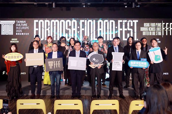 (文化部長李遠(前排右4)、外交部長林佳龍(前排左4)ㄧ同宣布「歐洲臺灣文化年」系列活動之一「F_F_F音樂節」即將在芬蘭赫爾辛基舉行,6組臺灣與芬蘭樂團同台搖滾。)
