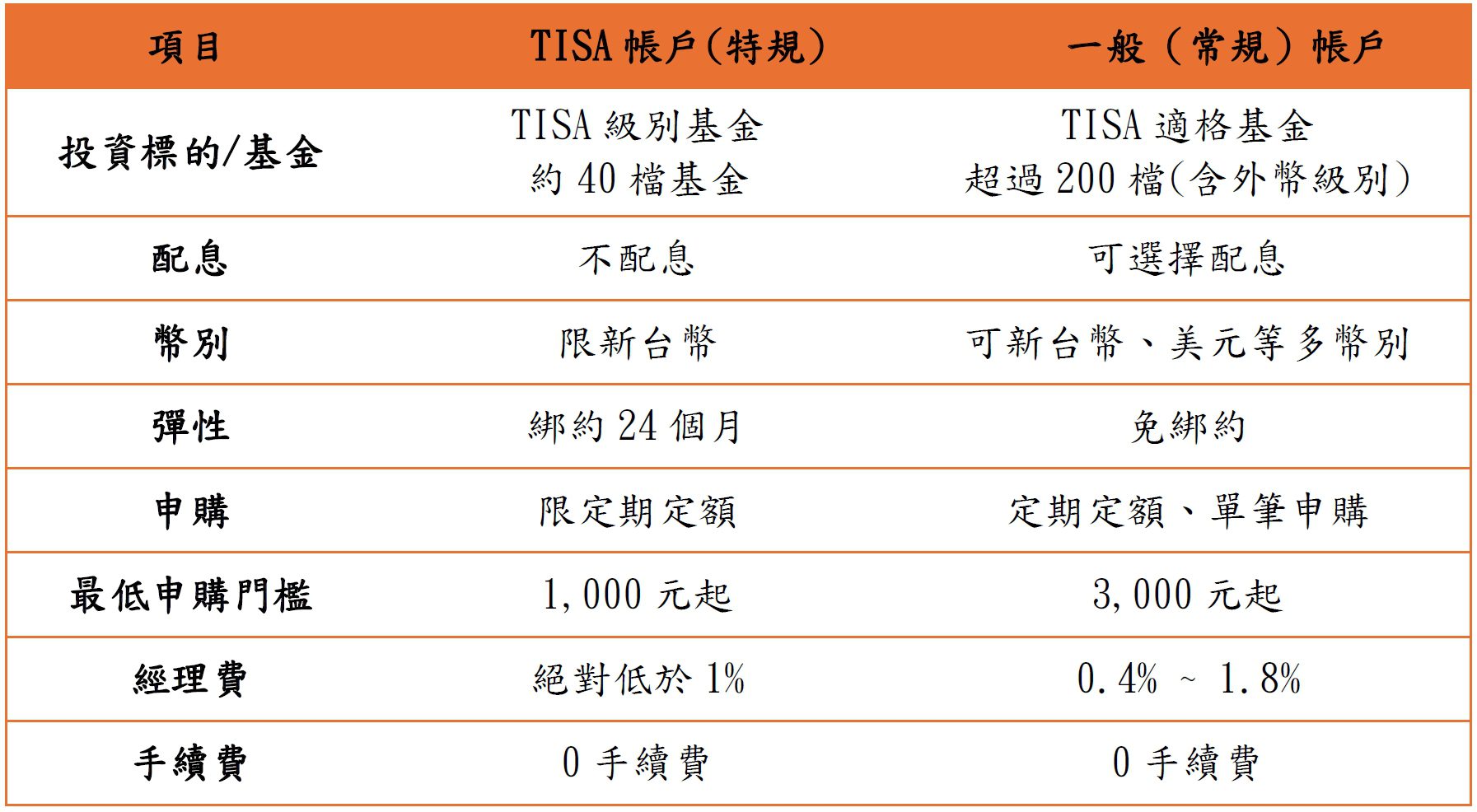 2.一般帳戶(常規):是民眾最熟悉的投資環境,主打「多元與彈性」。關鍵在於這個帳戶,可交易經官方審訂通過的那份「TISA適格基金」且無綁約限制。