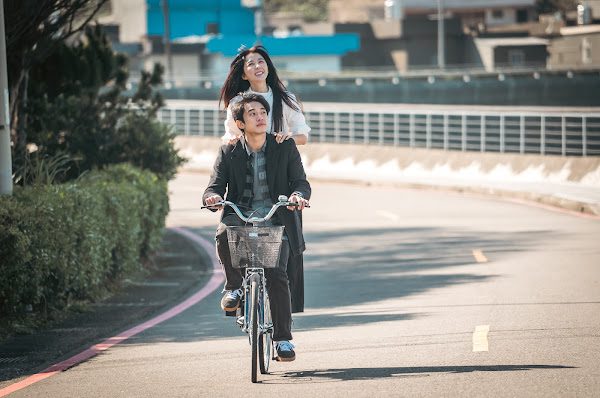 (《啵me之我的青春住了鬼》初孟軒騎腳踏車載著邵雨薇,畫面青春洋溢,但拍攝時必須忍著寒風吹拂。(圖片提供:風暴國際股份有限公司))
