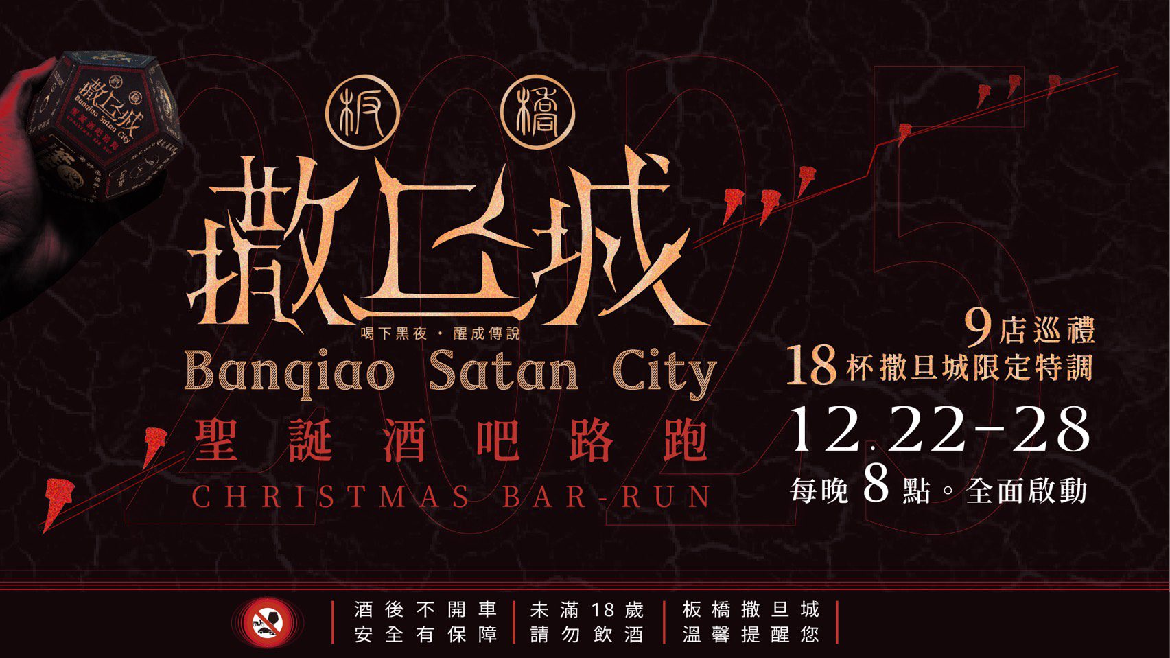 「撒旦城」是一場結合路跑與調酒文化的創意活動,以板橋夜生活為舞台,串連9間特色酒吧,打造屬於成年人的聖誕巡禮體驗。