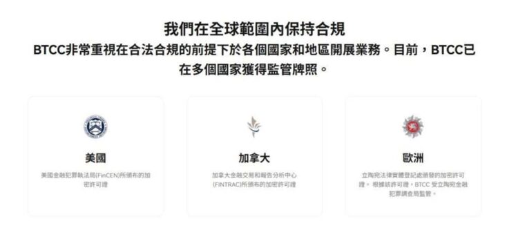 首先,BTCC 畢竟是 2011 年就成立的「老牌」交易所,在國際上的監管牌照算是給得很足,像是美國、加拿大、歐洲都有相關的監管許可。這代表它在跨國營運上,是願意接受多方檢視的。