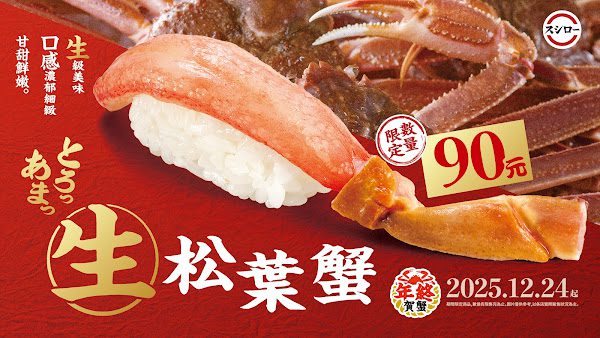 【WoWoNews】年末將臨,台灣壽司郎隆重推出「年終賀蟹」活動,獻上多款期間限定螃蟹壽司,從鮮甜飽滿的帝王蟹、香甜細緻的松葉蟹,到濃郁鮮美的紅雪蟹,每一道都兼具視覺與味覺享受。另外,人氣款「紅雪蟹肉海苔包」、「芡汁蟹肉茶碗蒸」等美味餐點也同步回歸,感謝廣大顧客這一年來的支持與愛護。