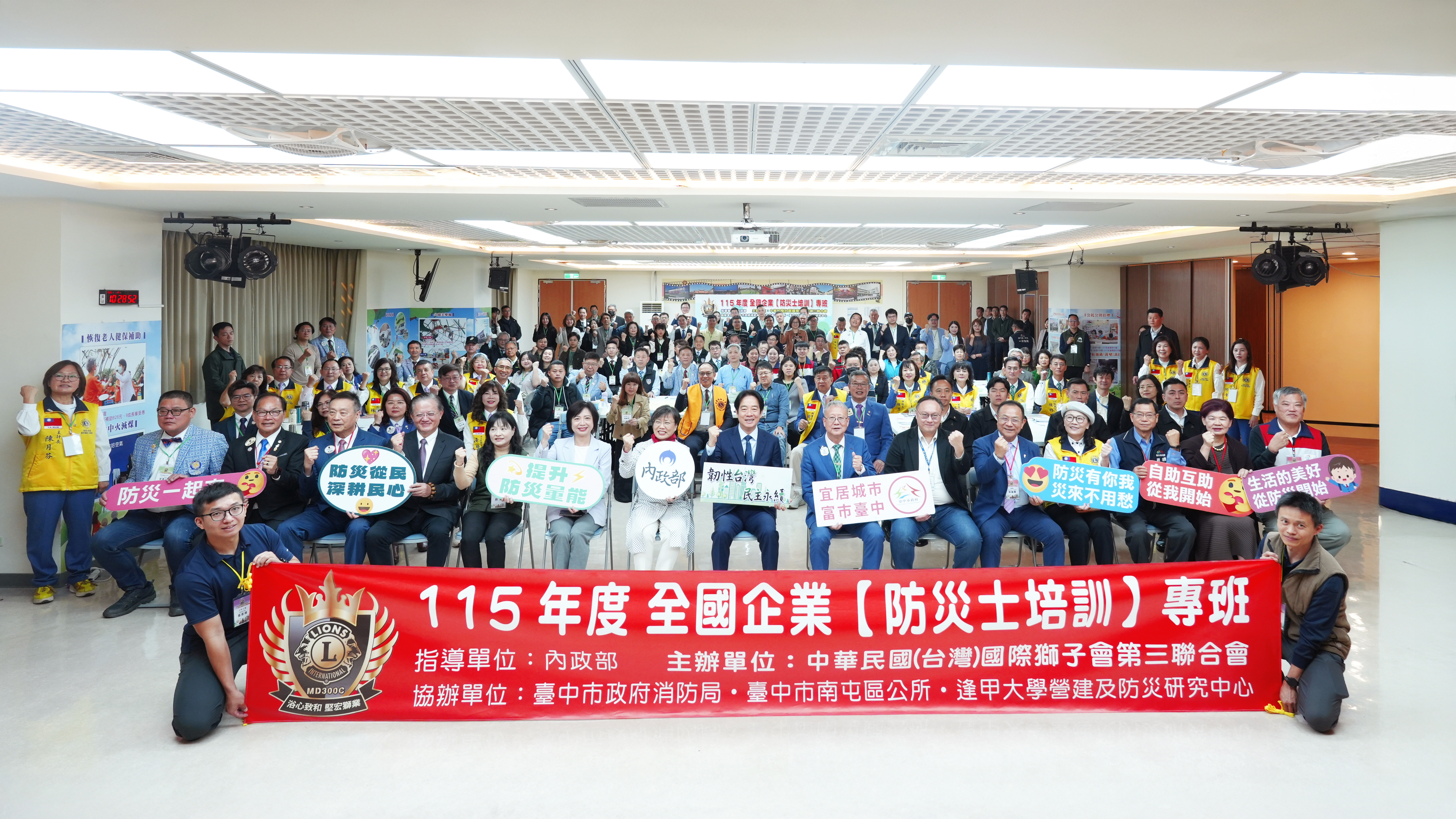 為強化全民防災能量、深化社會整體韌性,內政部輔導國際獅子會MD300C複合區於115年1月19日至20日舉辦全台首場國際性社團防災士培訓活動,以培育民間防災人力、提升社區自主應變能力為目標,由議長葉浴堅及防災士專案主委張鈴雪邀集全國各地獅友踴躍參與,總統賴清德及內政部部長劉世芳親臨會場致詞,並聽取學員簡報、觀摩學員操作實況,肯定民間團體積極投入防災培力工作,並期勉學員成為社區防災的重要支柱。