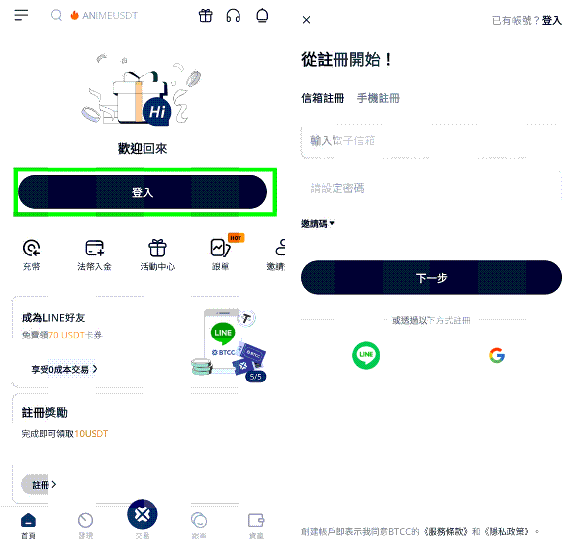 打開 BTCC App,首頁點擊「登入」後,進入登入與註冊頁面。