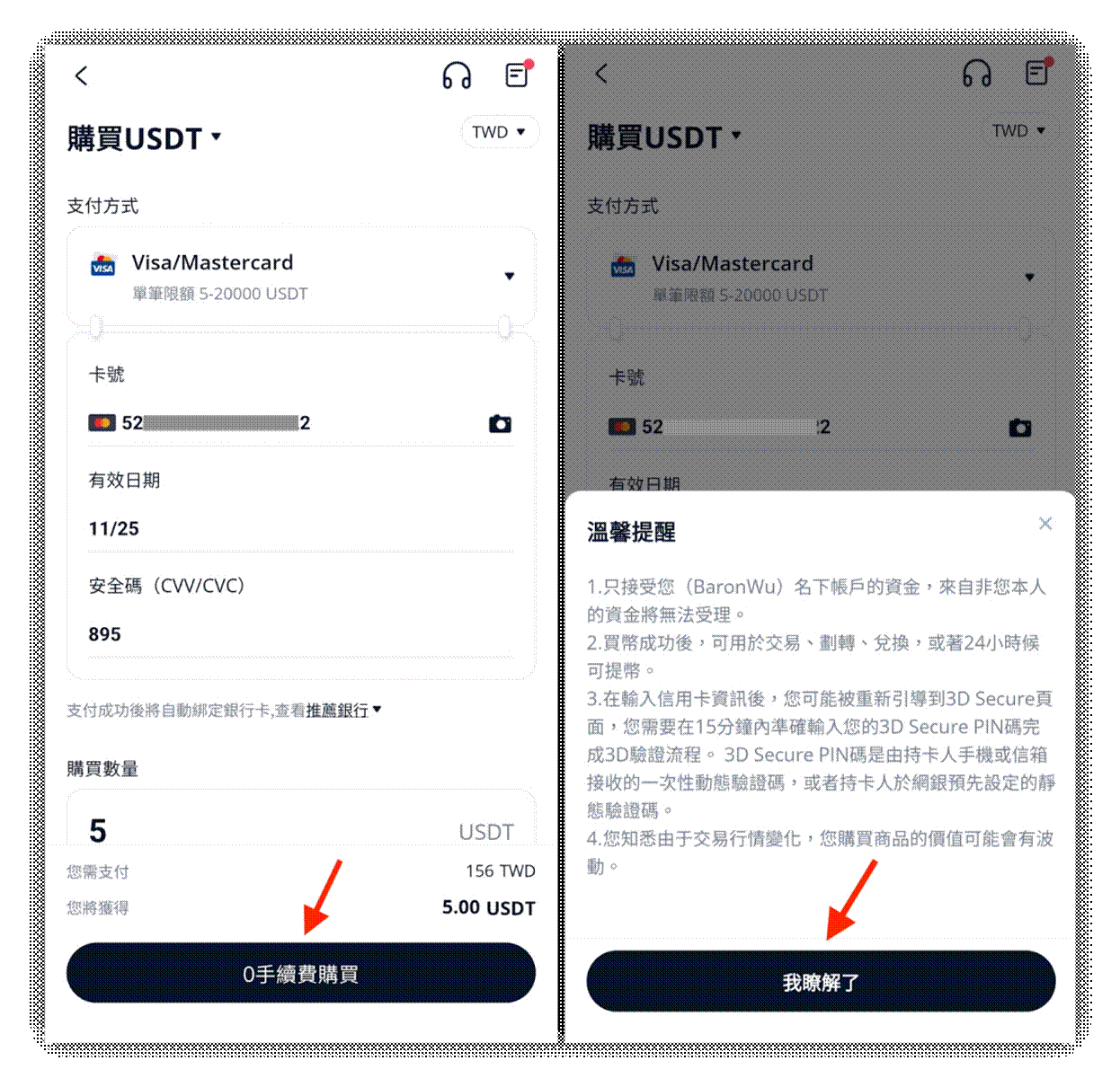 輸入「Visa/Mastercard」卡片資訊(卡號、有效日期、安全碼),並輸入USDT的購買數量。確認需要支付的金額後,點擊下方「0手續費購買」。