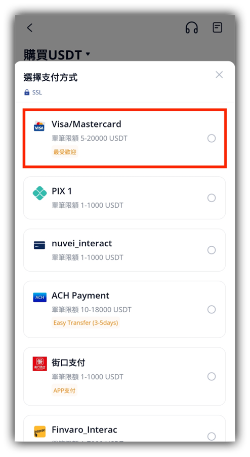 在法幣列表中選擇支付方式,這裡以「Visa/Mastercard」為例。
