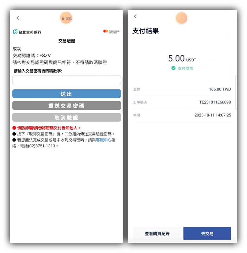 提示需要進入3DS驗證頁面(下方左圖所示),不同銀行的3DS交易驗證頁面不同。一定要正確輸入驗證碼才能完成支付。