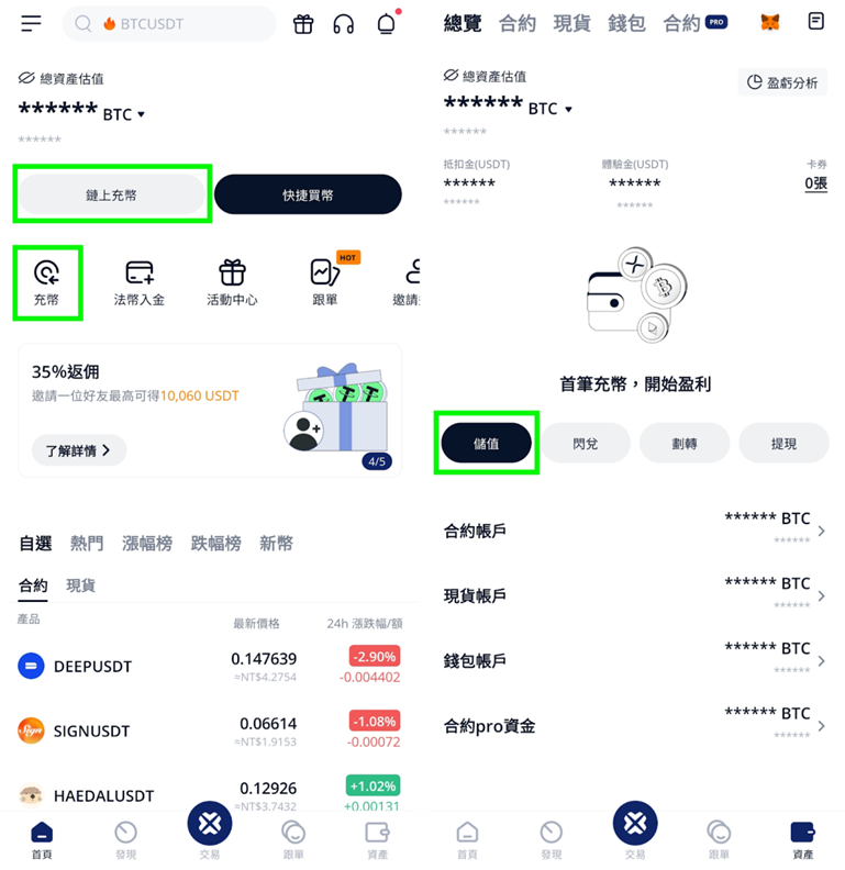 打開 BTCC APP,首頁點擊「充幣」或「鏈上充幣」;或前往「資產」頁面,然後選擇「儲值」。