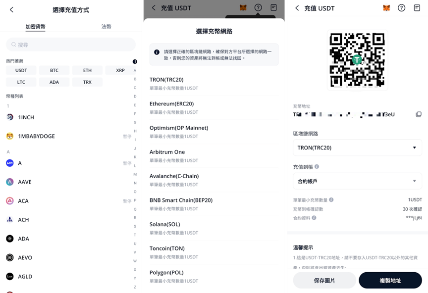 - 選擇充幣網路,例如選擇【TRON(TRC20)】。