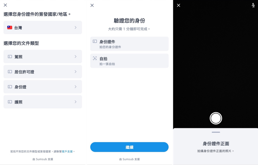選擇您身分證件的簽發國家/地區與證件類型(以台灣地區為示例),接著為您的證件(正面)拍照並上傳。
