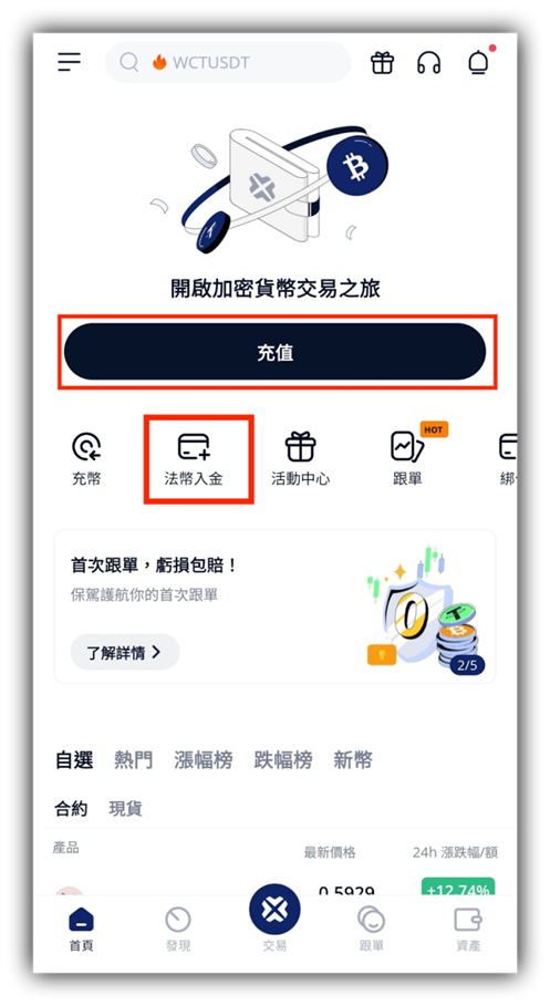 打開 APP 後,可透過以下任一方式進入法幣購買 USDT 頁面:①首頁點擊「充值」或「法幣入金」按鈕;②或在「資產」頁,點擊「充值」,進入「法幣」。
