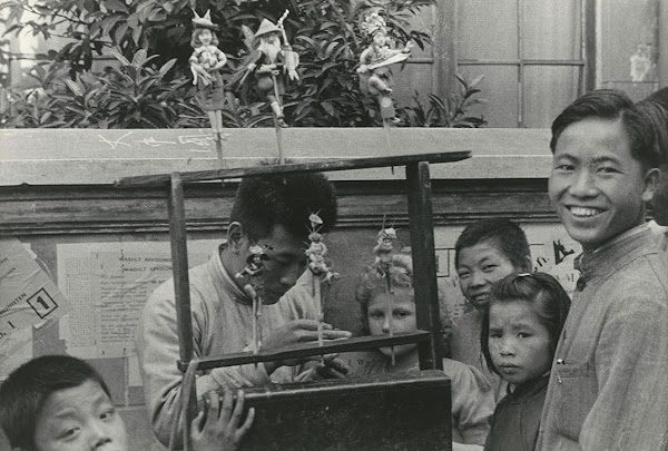 (捏麵人〉 位在照片中央的是捏麵人展示的木架子,架上的捏麵人偶有手持大刀、頭戴盔帽的豫劇武生,還有身披簑衣、頭戴笠帽和腰間繫只葫蘆的老叟,最特別的是一尊穿著及膝裙套裝,頭戴女士帽及抱著寵物的西方女性。一群孩童圍繞在師傅四周,年齡大小不一,除了華人面孔,還有一位外國女孩)