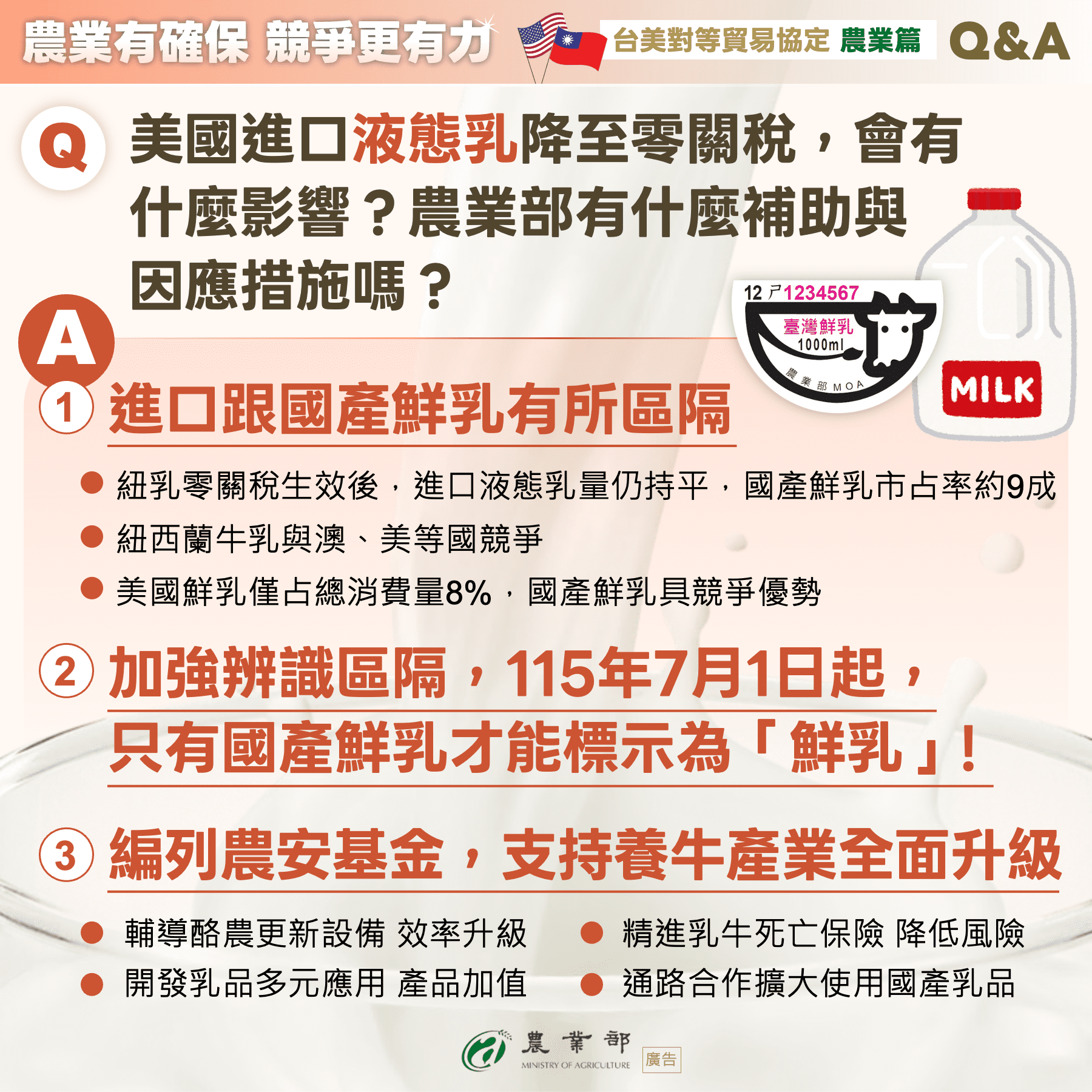 台美對等貿易協定已於台北時間2月13日正式簽署,其中美國液態乳的進口關稅將取消,農業部表示,國產鮮乳長期自給率維持約9成,美國鮮乳僅約占國人總消費量8%,對美降稅雖可增加美國產品的價格優勢,但長期以來,在地新鮮一直是國人選購乳品的首要考量,且美國鮮乳係以賣場自有品牌為主要通路,預期降稅後將是進口國產品相互競爭,對國產鮮乳影響有限。為捍衛國產鮮乳9成自給率,政府將攜手產業,妥善運用4年24億元經費,落實執行113至116年養牛中程計畫,並依總統指示成立農安基金,擴編韌性特別預算,盡全力協助酪農產業。同時也將透過鮮乳標章升級為證明標章,讓國人清楚辨識國產鮮乳與進口牛乳,並積極推廣餐飲通路優先使用國產鮮乳,確保國產乳品在國內市場的消費黏著度。