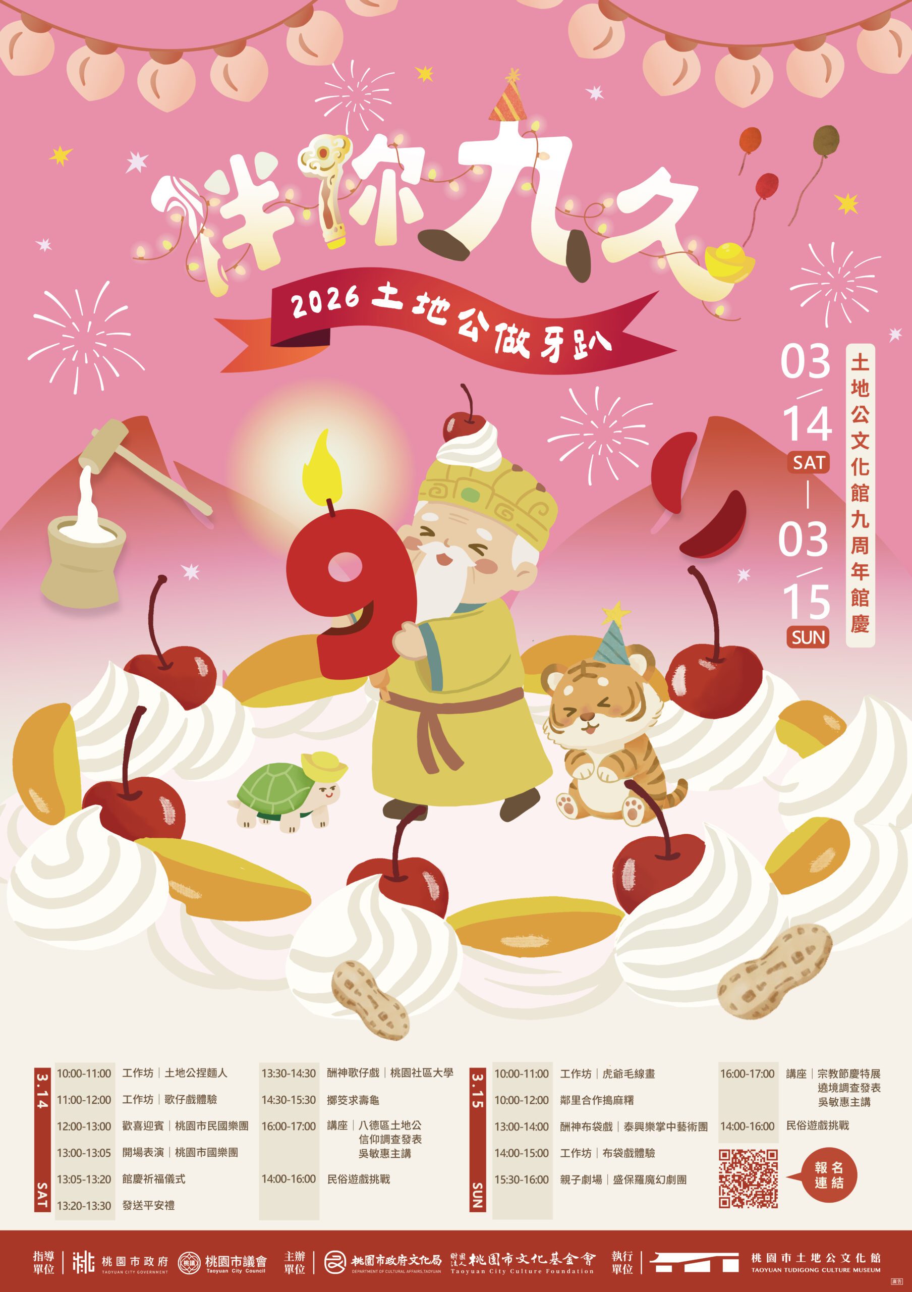 3月14日至15日將舉辦重頭戲「伴你九久—土地公・做牙趴」土地公文化館九周年館慶,連續兩日安排最具地方特色的酬神祝壽表演,包括桃園社區大學酬神歌仔戲、泰興樂掌中藝術團,重現傳統民間藝術風采。3月14日規劃土地公捏麵人、歌仔戲體驗工作坊、傳統科儀三獻禮及擲筊求壽龜;3月15日則有鄰里搗麻糬、虎爺毛線畫及布袋戲體驗工作坊。兩日皆設有民俗遊戲挑戰及市集活動,適合親子共遊。