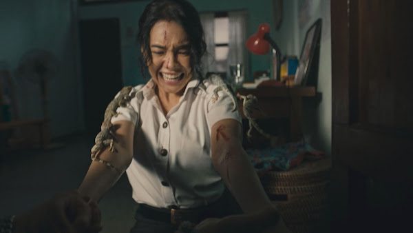 《邪降:覺醒》講述出生自帶詛咒的「潘娜」,原想在大學重啟新生,卻慘遭六名學長姐的霸凌與降術迫害,進而激發體內埋藏的強大邪力,變身冷血獵人展開血腥殺戮。飾演潘娜的泰國人氣女星丘普朗阿瑞昆(Cherprang Areekul)此次再度回歸邪降宇宙,拚命程度更勝以往。一場與數十隻大壁虎(又稱大守宮)近距離對戲的戲碼中,一隻大壁虎在飼養員鬆口的瞬間情緒失控,轉頭狠咬丘普朗,當場留下清晰齒痕與血跡。