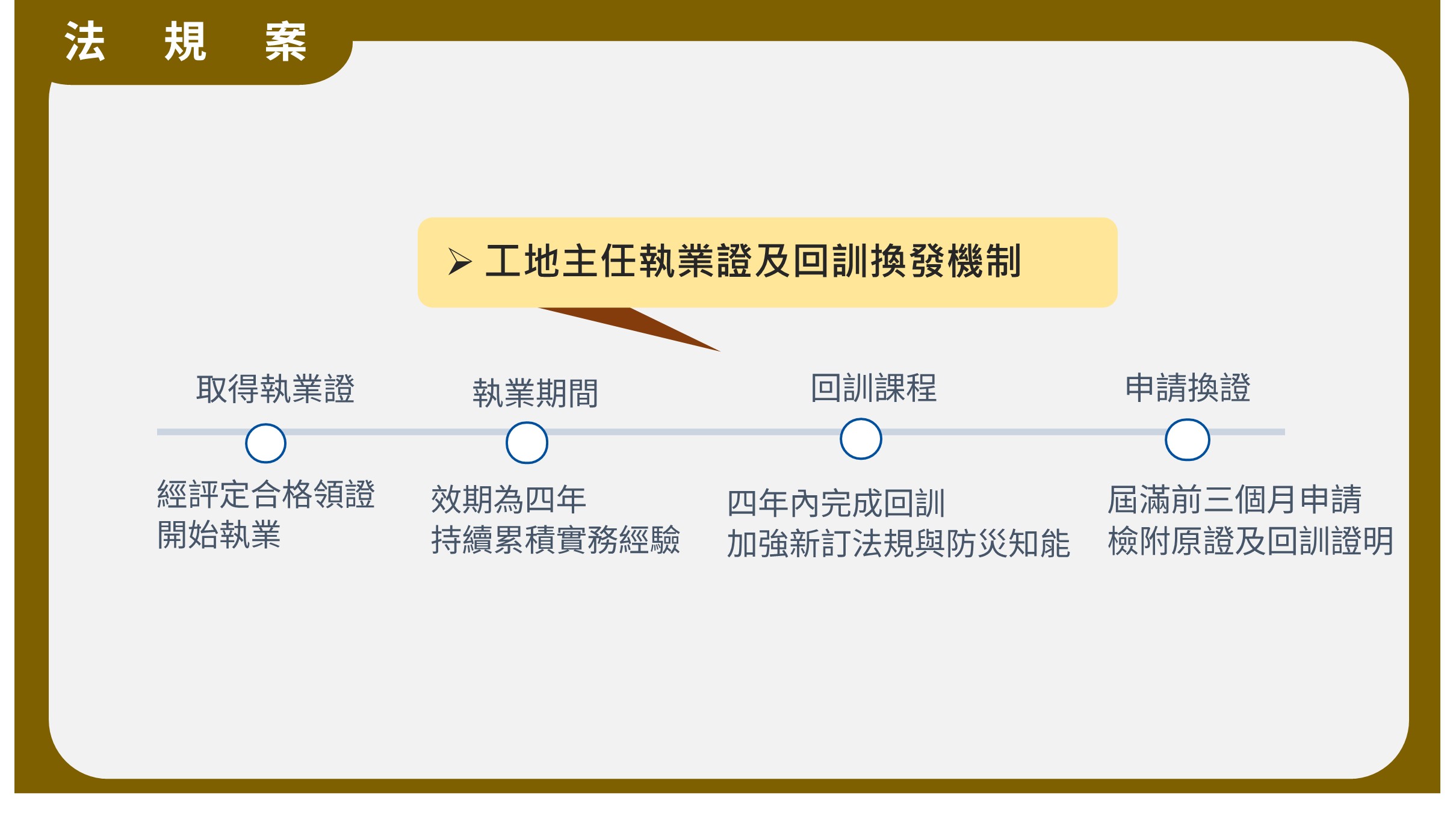 內政部說明,本次修正特別將施工安全及防災等項目納入回訓課程範疇,以期能降低工安事故發生風險,落實施工安全管理機制,並明定工地主任應於4年內完成回訓,及增訂工地主任執業證換發程序,明確規範執業證有效期限、回訓內容、時數與期間等事項的審查標準,以提升營建從業人員防災意識,進而強化國內重大公共建設的施工安全與品質。為因應實務運作需求,本次修正擴大受託辦理營造業工地主任評定、訓練與管理業務的對象,增列「法人」為受託單位。