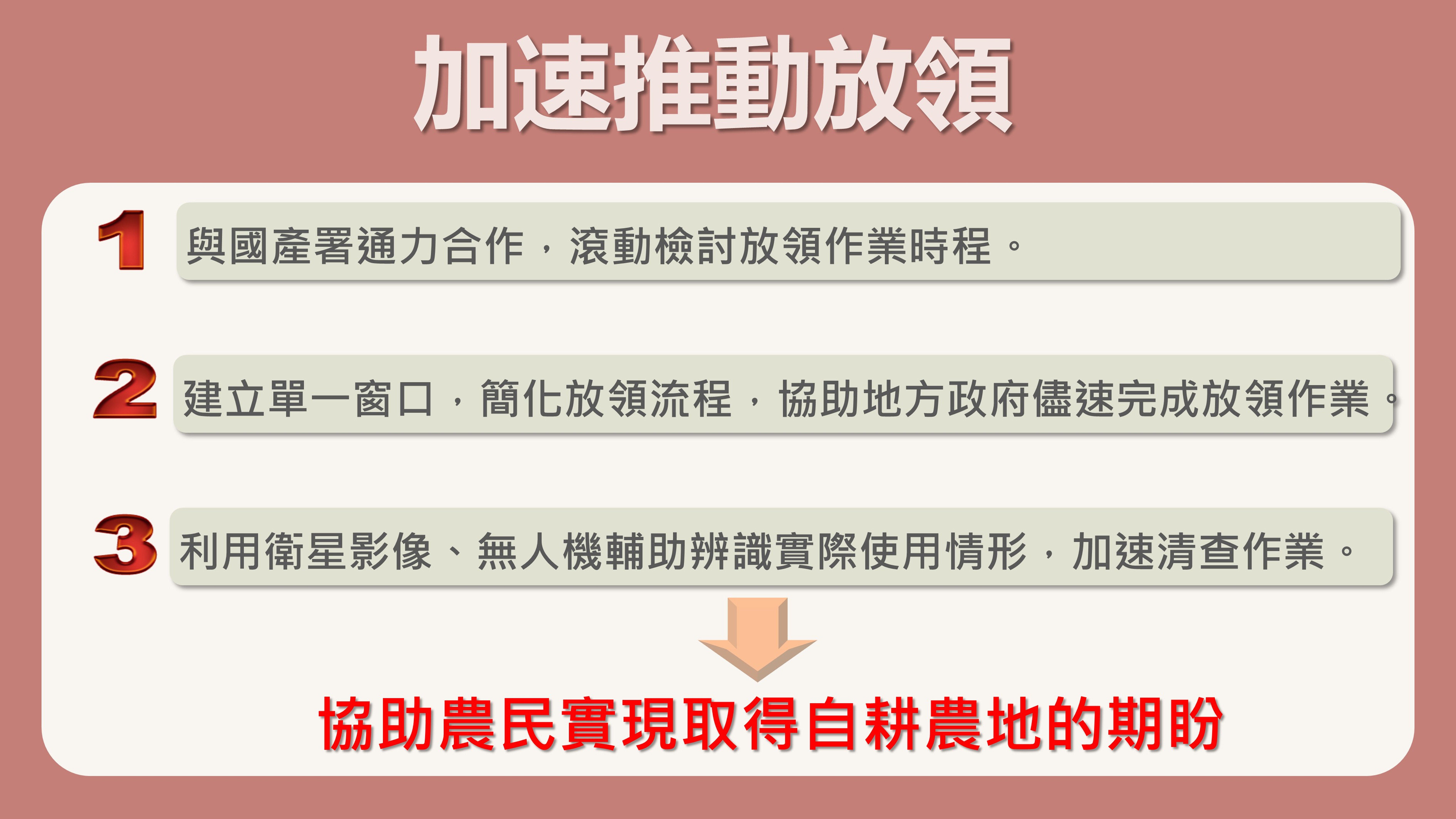 近期內政部也將舉辦放領業務研習會,透過案例經驗分享與研討,讓第一線縣市政府同仁能更熟悉法令規定及行政流程,加速整體放領作業的進行,協助農民能順利取得承領耕地。此外,目前除臺中市及臺南市政府正在辦理法制作業外,相關縣市政府已成立放領工作小組,將持續督請市政府儘速成立。
