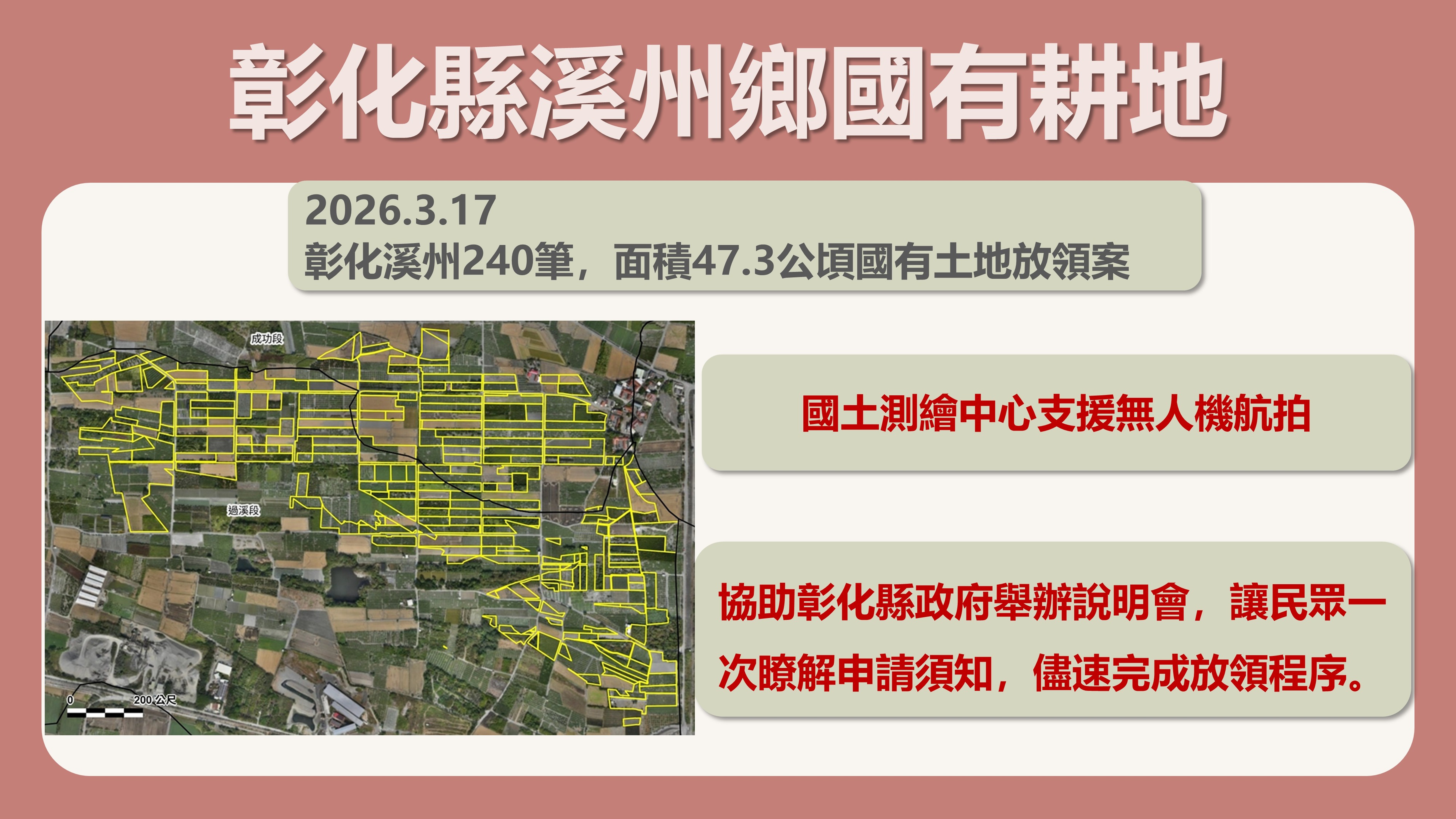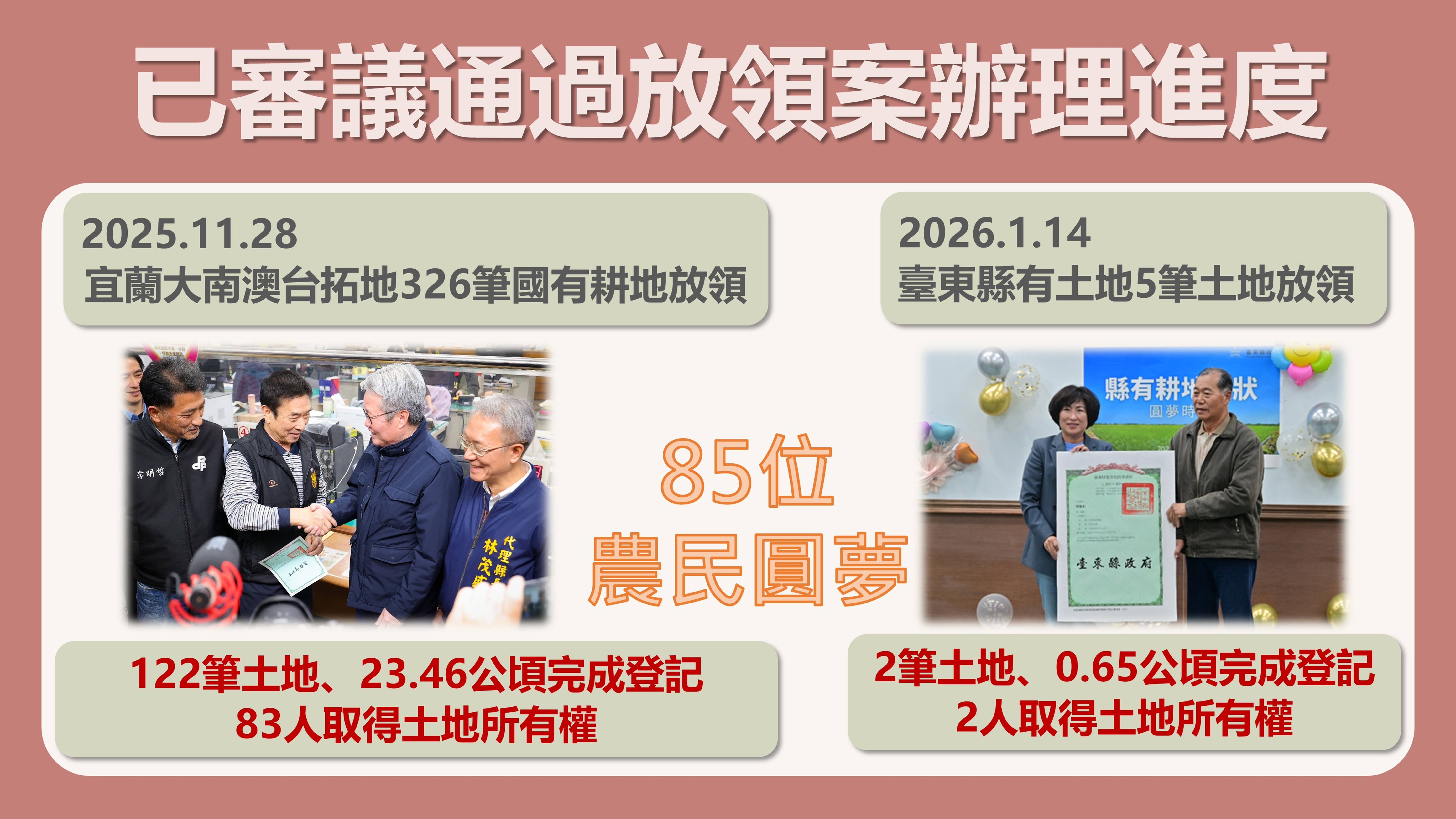 劉世芳指出,在中央與地方通力合作下,內政部持續會同財政部國有財產署及各縣市政府全面展開租約清查、放領審議等作業,目前已審議通過放領宜蘭縣大南澳(326筆,約64.3公頃)、臺東(5筆,約2.8公頃)及彰化縣溪州(240筆,約47.3公頃)等3區,合計571筆,約114.4公頃的國有及縣有耕地。