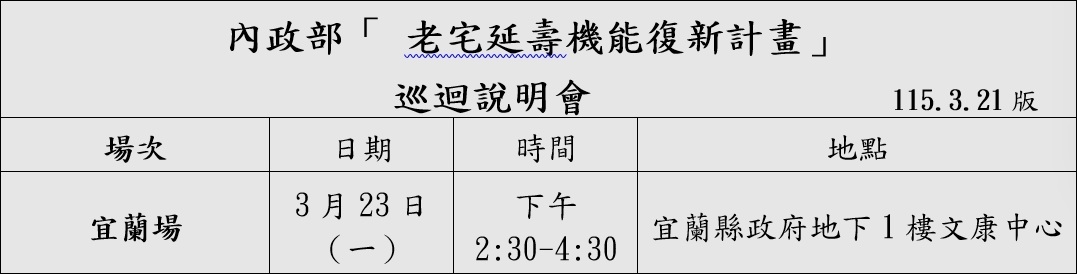 內政部最後表示,今天到場立委陳瑩、立委莊瑞雄及立委黃建賓均對「老宅延壽機能復新計畫」表示肯定,考量地方鄉親多有老屋修繕之需求,未來老屋修繕若納入「都市危險及老舊建築物加速重建條例」修法檢討時,將予以支持。目前全國已辦理16場說明會,場場均獲得民眾熱烈反應,顯見民眾對老屋翻新的需求。說明會下一站將於3月23日(星期一)下午2時30分,移師至宜蘭縣政府地下1樓文康中心舉辦,歡迎宜蘭鄉親把握機會參與。如民眾無法親赴現場參與,可電洽諮詢專線(02)7701-9919,或上「都市更新入口網-老宅延壽專區」(https://twur.nlma.gov.tw)查詢。