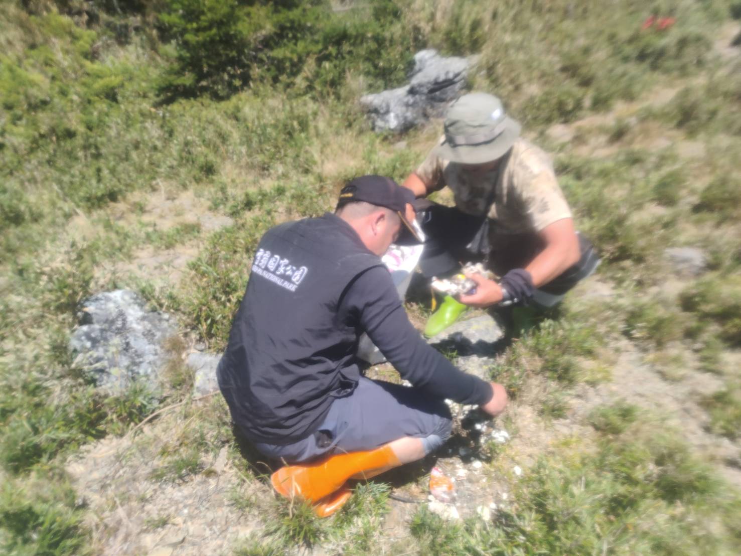 • 雪霸保育巡查員和布農協作夥伴,正彎著腰,還給山一片淨。(雪霸保育巡查員提供)