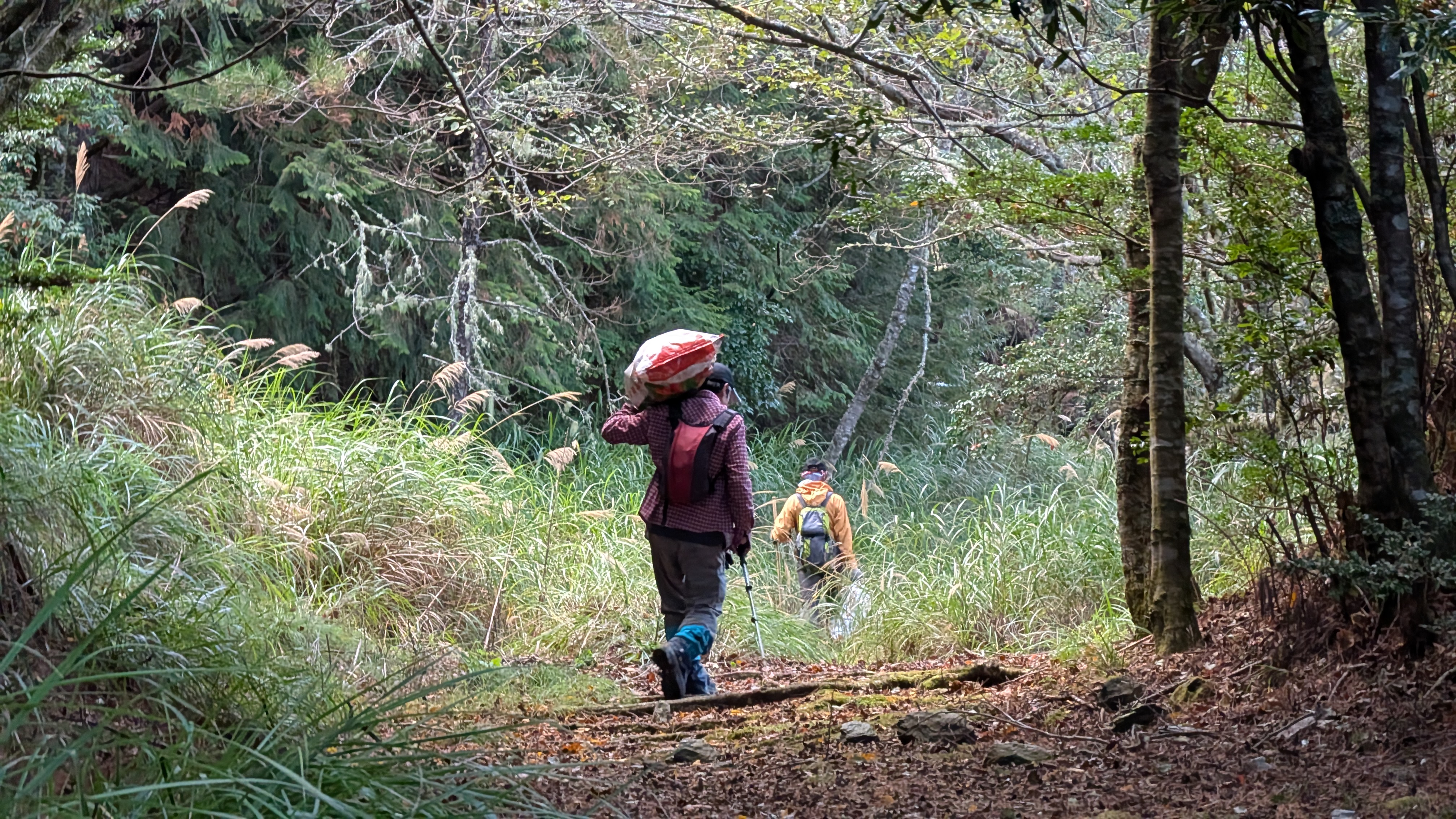 • 雪霸保育志工背垃圾下山,背影與山一樣值得敬重。(雪霸保育志工提供)