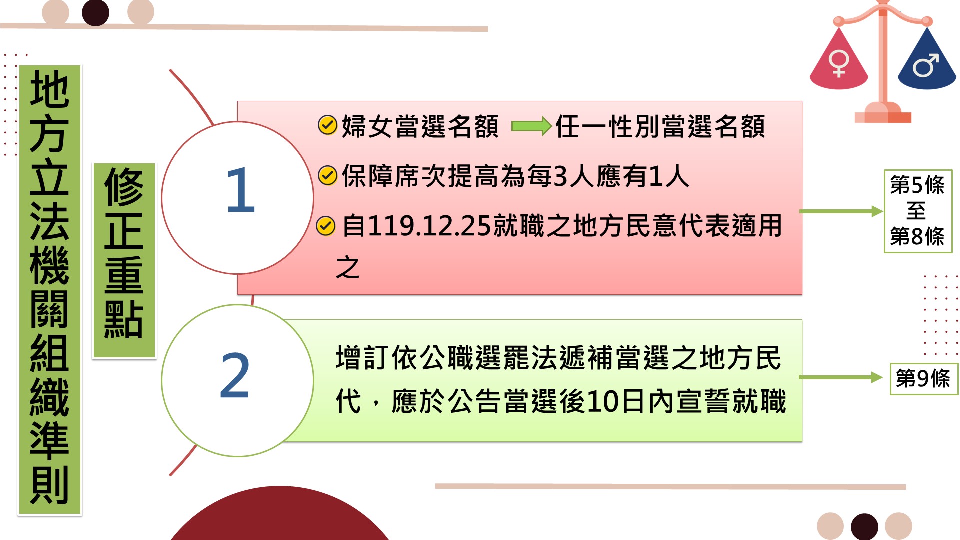 內政部說明,這次「地方立法機關組織準則」將直轄市議員、縣(市)議員、鄉(鎮、市)民代表及直轄市山地原住民區民代表每4人應有婦女保障名額1人的規定,修正為每3人應有任一性別當選名額1人,並自119年12月25日就職的地方民意代表適用。另外,增訂依公職人員選舉罷免法規定遞補當選之地方民意代表當選人,應於選務機關公告遞補當選後10日內,由地方立法機關依宣誓條例規定辦理宣誓就職,以明確規範其宣誓就職事宜。