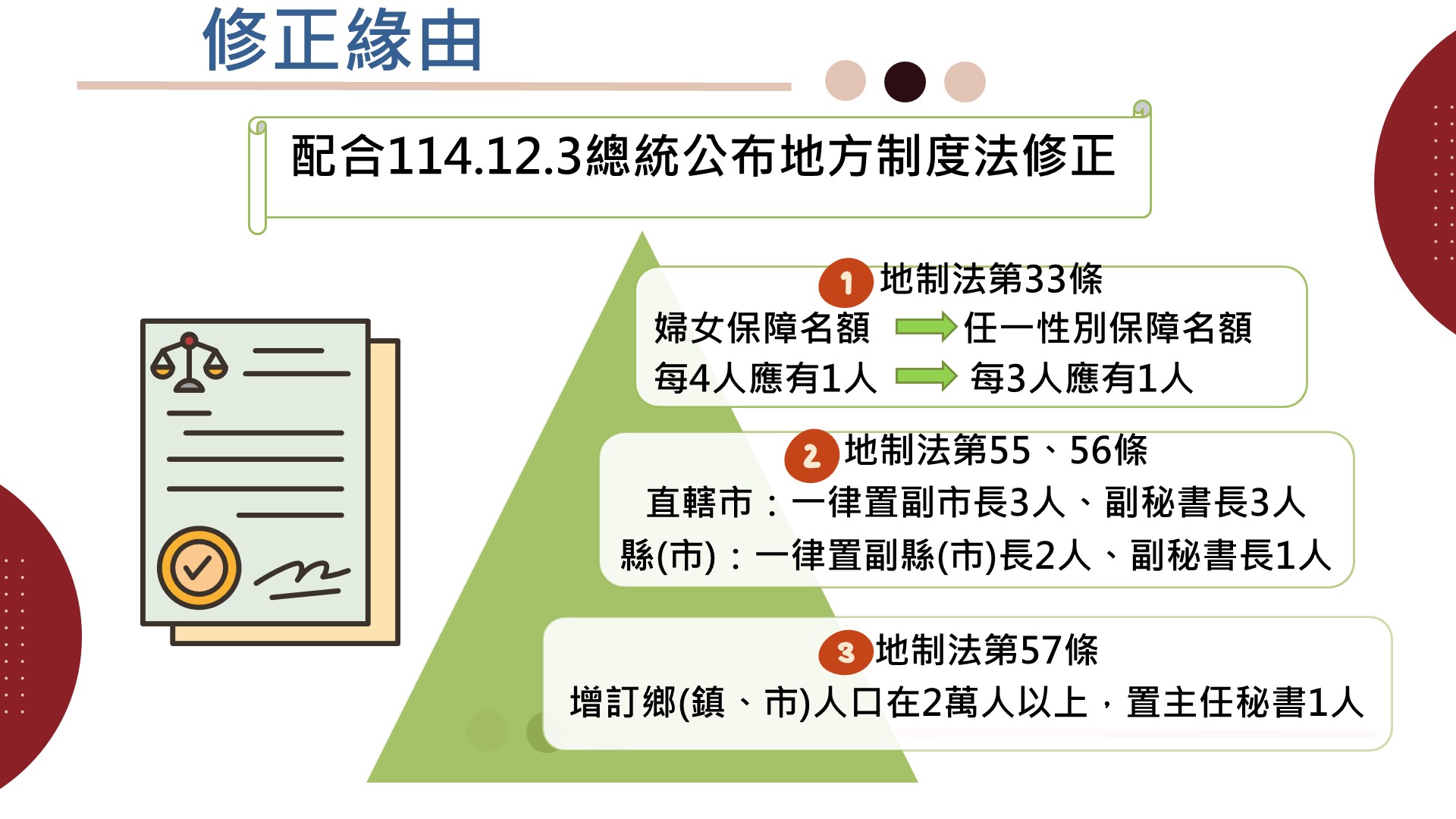 內政部於今(2)日部務會報通過「地方立法機關組織準則」及「地方行政機關組織準則」部分條文修正草案。部長劉世芳表示,這次修法主要是配合114年12月3日修正公布的地方制度法規定,調整兩部子法內地方民意代表性別保障名額、直轄市與縣(市)政府副市(縣)長及副秘書長人數,以及鄉(鎮、市)公所設置主任秘書的相關規定,修正草案後續將依程序報行政院核定,以強化性別平等參政與明確地方人事任用規定。