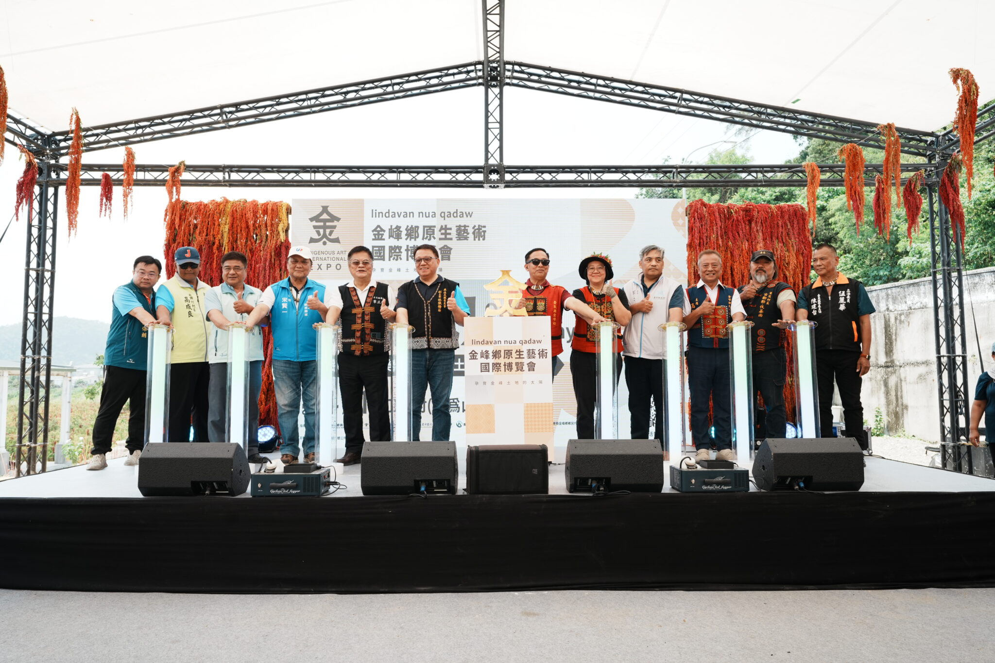開幕儀式由金曲歌王王宏恩擔綱開場,以原生音韻點燃現場氣氛,啟動儀式則由金峰鄉長蔣爭光與貴賓共同點亮燈柱上方,當象徵金峰鄉的「金」字緩緩升起,不僅宣告博覽會正式拉開序幕,更象徵金峰鄉將深植於土地的紅藜以文化為根,正式向世界開展成嶄新篇章,禮成後,現場嘉賓在嘉蘭國小鼓隊的動感節奏引領下,步行前往午宴會場,共同見證這場結合原民文化、綠色生態與循環經濟的藝術盛事。