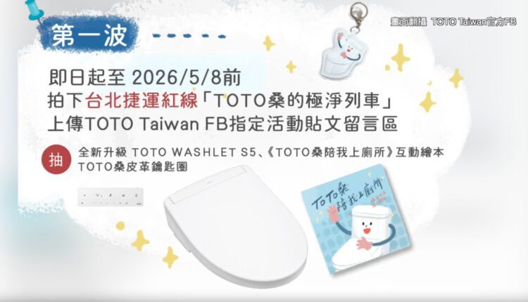 不只好看、好拍,還有機會把大獎帶回家!即日起至5月8日(五)止,只要搭上「TOTO桑的極淨列車」,拍下車廂內照片並上傳至TOTO Taiwan官方Facebook指定貼文留言區,就有機會抽中最大獎「全新升級WASHLET S5(價值NT$32,400)」,以及《TOTO桑陪我上廁所》立體兒童繪本、TOTO桑皮革造型鑰匙圈等好禮。