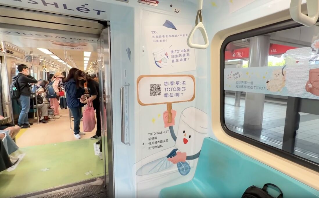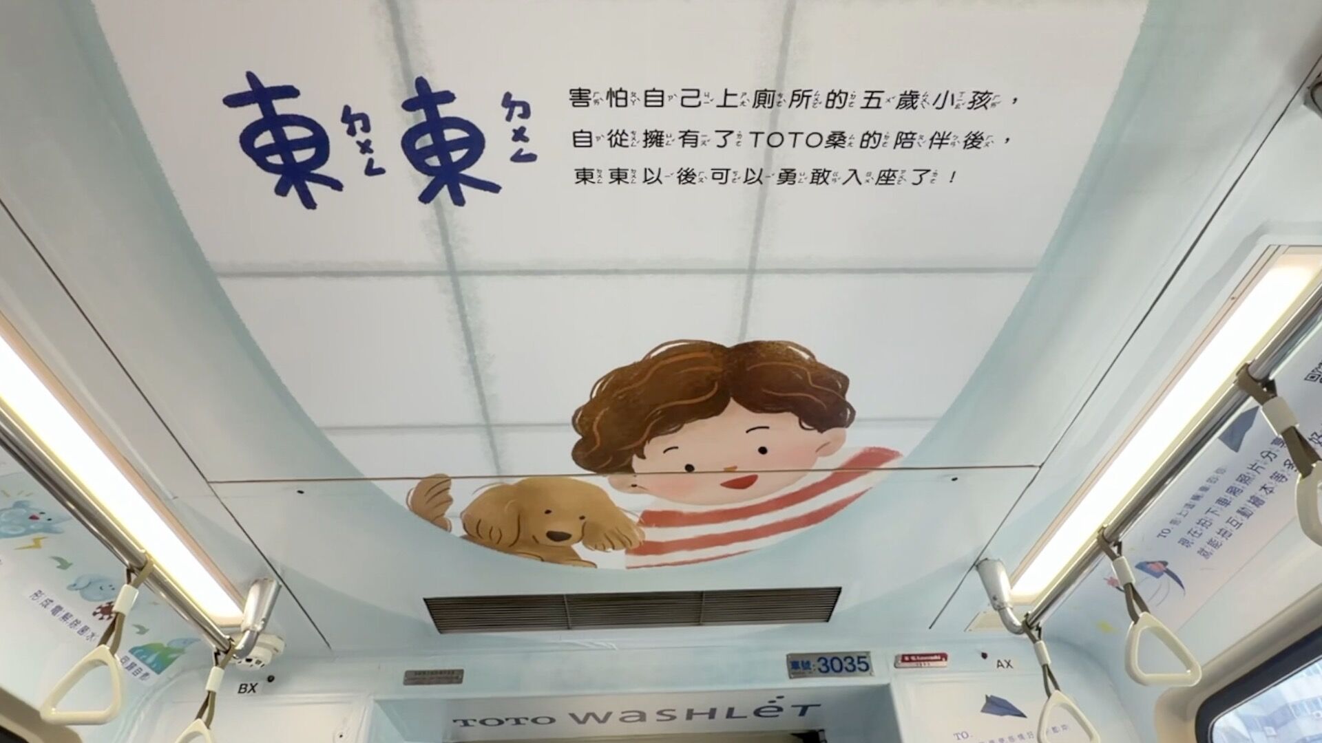 乘客分享,一走進車廂就發現整體都是插畫設計,氛圍相當童趣,甚至滑手機時還一度以為「有人在看」,抬頭才發現是角色東東從上方探頭,搭配車廂空間設計,彷彿置身在馬桶裡,臨場感十足,讓人印象深刻。她也提到,在搭乘過程中才知道,原來TOTO是最早發明免治馬桶的品牌,讓她在通勤之餘,也多認識了一些相關知識。