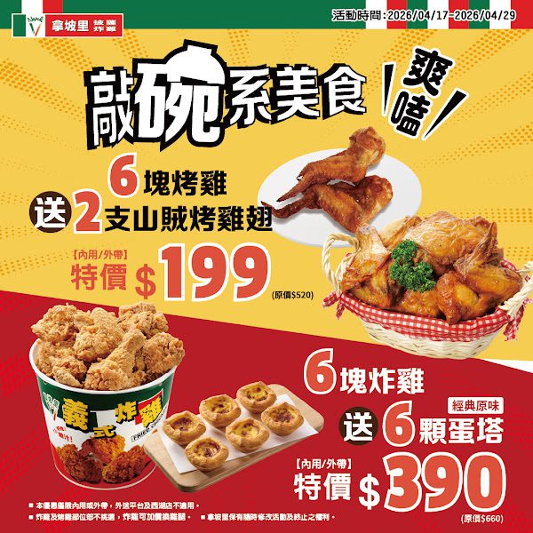拿坡里人氣炸雞與烤雞雙主打,推出「6塊烤雞送2支山賊烤雞翅」,原價520元 特惠價199元;同時針對甜點愛好者,推出「6塊炸雞送6顆蛋塔」,原價660元 特惠價390元,讓烤雞、炸雞與甜點一次滿足。無論是外皮金黃微酥、肉質鮮嫩多汁的烤雞,或是外酥內嫩的炸雞搭配香濃滑順的蛋塔,都讓人一口接一口,輕鬆享受高CP值帶來的滿足感。