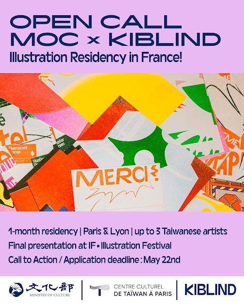 獲選藝術家將由KIBLIND巴黎及里昂團隊接待,安排藝文機構參訪、專業交流及創作工作坊,並於里昂駐地進行創作實踐,最終成果將於里昂國際插畫藝術節期間公開展出,拓展國際曝光與合作契機。