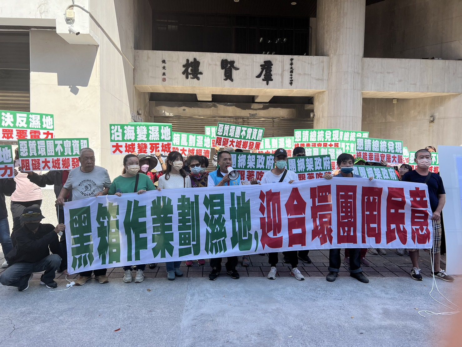 彰化縣政府農業處9月底決議向中央提出申請,把彰濱工業區以南到濁水溪口劃設為國家濕地,未來彰化芳苑、大城沿海不得設置太陽能與風力發電等綠能產業,引發地方強烈反彈;逾50位大城鄉民(25)日在彰化大城鄉村長聯誼會會長許仁寶帶領下,至立法院外陳情,並上演行動劇抗議職業環體以假訊息扼殺當地產業發展。